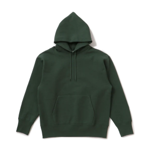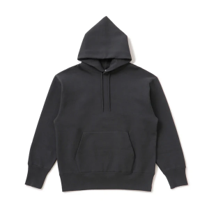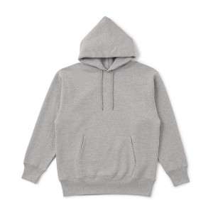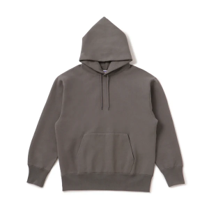 着用した際にしっかりとボリュームの出るフード部分、身生地同色の丸紐、シルバーのアイレット、カンガルーポケットなどのディテール部分も手抜きのない仕上がりです。