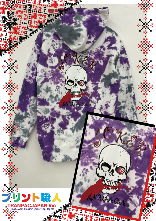タイダイ染め×メタプリント!フードと袖に名入れをしています。